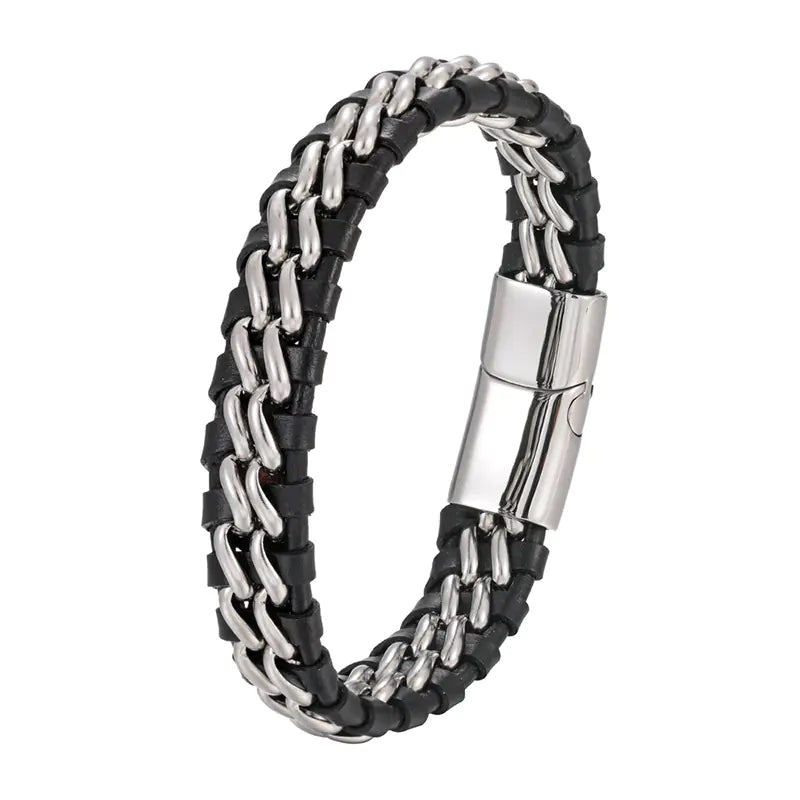 The intricate design features a woven leather strap that adds a unique touch to your look, making it suitable for both casual and formal occasions. Whether you're dressing up for a night out or simply want to enhance your everyday attire, this bracelet is the perfect choice.